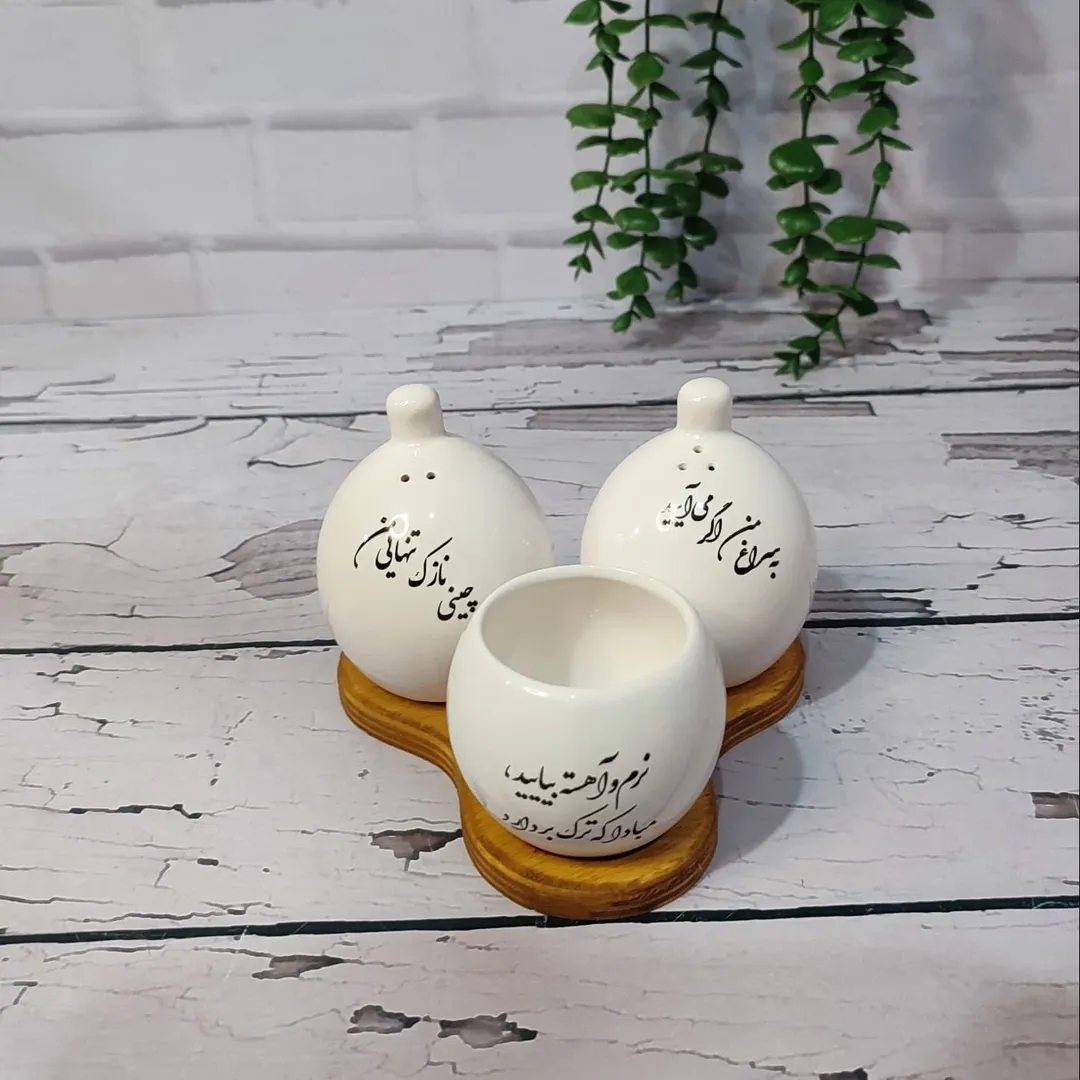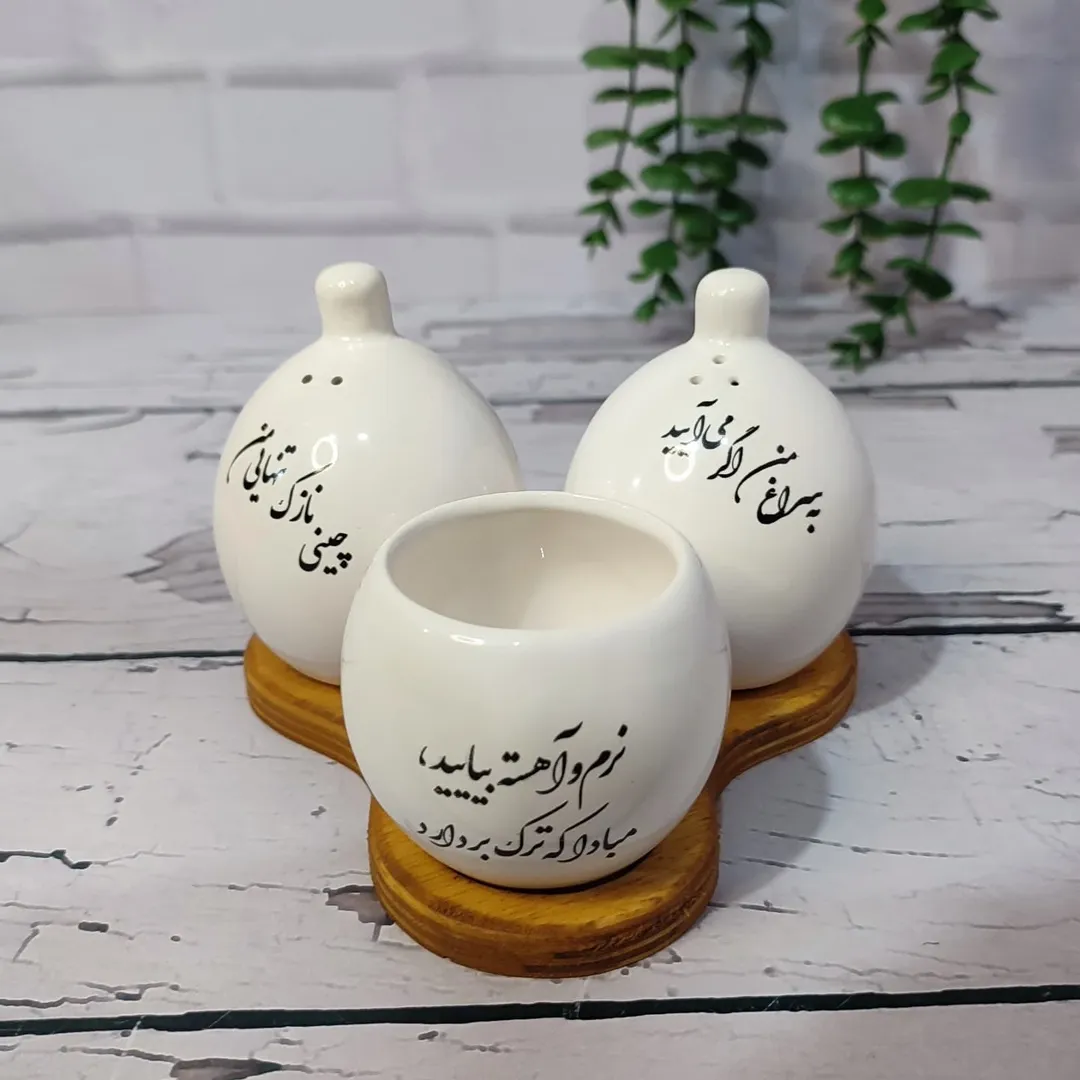 ست سرامیکی ادویهدان با طراحی خوشنویسی فارسی یک ست خاص و چشمنواز برای آشپزخانههای ایرانی! این ست سهتایی ادویهدان با طراحی سرامیکی و نوشتههای زیبای فارسی، هم کاربردی است و هم جنبه تزئینی دارد. قرار گرفتن هر سه ظرف روی پایه چوبی شیک، آن را به انتخابی ایدهآل برای میز غذا یا دکور آشپزخانه تبدیل کرده است. مشخصات کالا رنگ: سفید با نوشته مشکی جنس: سرامیک با پایه چوبی روس قابل شستشو تعداد قطعات: سه عدد (دو نمک/فلفلپاش + یک ظرف خلال دندان) ویژگی خاص: خوشنویسی فارسی روی بدنه