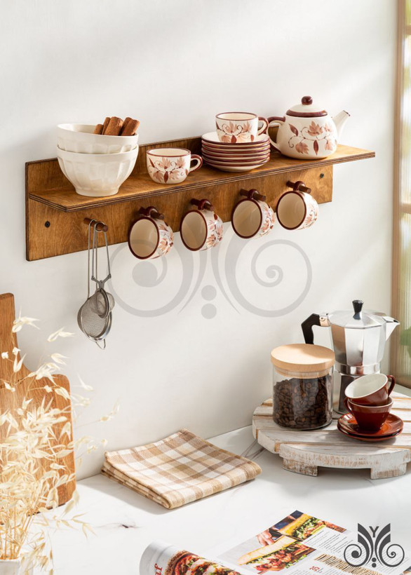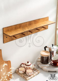 این شلف چوبی با طراحی ساده اما چشمنواز، هم یک طاقچه برای وسایل دکوراتیو داره و هم ۵ قلاب چوبی برای آویزون کردن لیوان، دستگیره، حوله یا اکسسوریهای سبک.