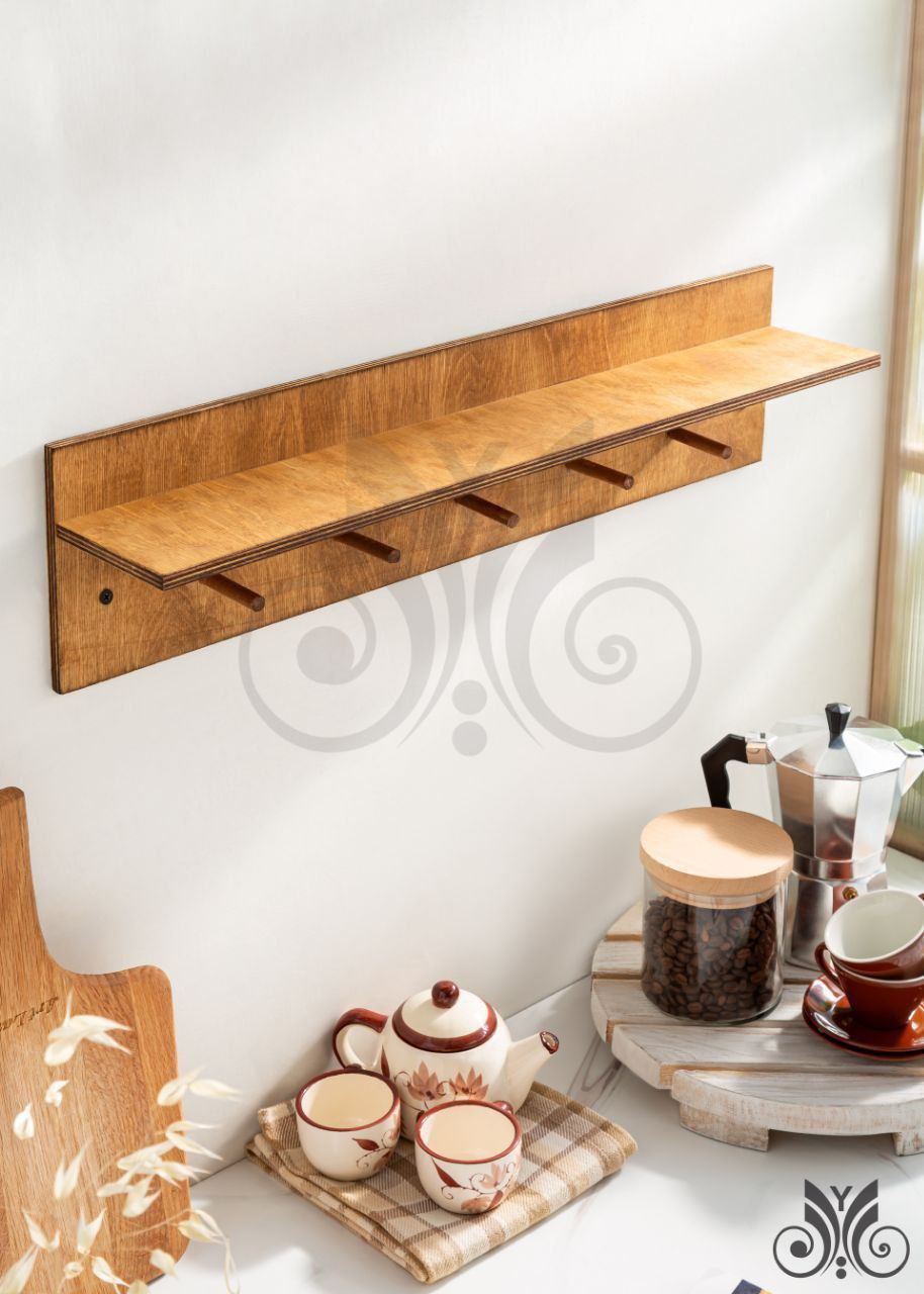این شلف چوبی با طراحی ساده اما چشمنواز، هم یک طاقچه برای وسایل دکوراتیو داره و هم ۵ قلاب چوبی برای آویزون کردن لیوان، دستگیره، حوله یا اکسسوریهای سبک.