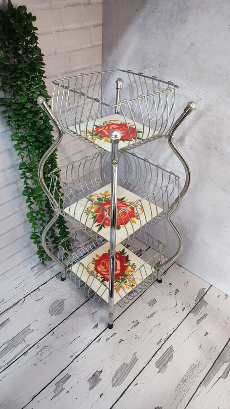 این استند سهطبقه با بدنهی فلزی براق و کف چوبی طرحدار، انتخابی عالی برای نظم دادن به مواد غذایی در آشپزخانهست.