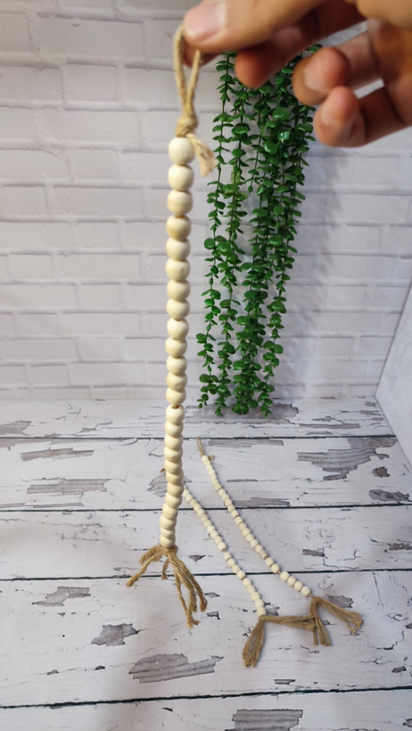 آویز مهره چوبی دکوری، انتخابی ساده و خاص برای تزئین میز، شلف یا دکور منزل. ساخته شده از مهرههای چوبی طبیعی با نخ کنفی، مناسب برای سبکهای مینیمال و روستیک.