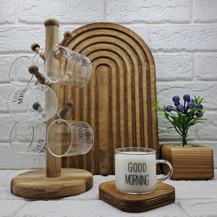 شش شات پیرکس تکجداره با نوشته «Good Morning» مشکی و فونت مینیمال، برای اسپرسو، شات قهوه، دمنوش، چای یا حتی دسرهای کوچیک