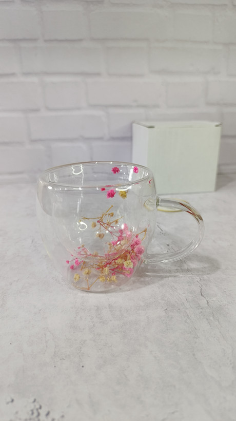 لیوان پیرکس دوجداره با گلهای خشک طبیعی (رنگ صورتی-سفید) که بین دو لایه شیشه گیر کردن و هیچوقت نمیریزن. نوشیدنیتون تا آخرین جرعه داغ میمونه، دستتون نمیسوزه و هر بار که نگاهش میکنید، انگار بهار تو لیوانتونه.