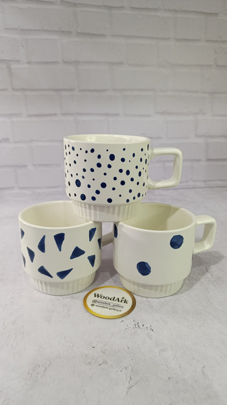 با بدنه سفید و طرحهای نقاشی شده آبی (نقطه، اشکال هندسی)، این ماگها یه حس دستساز و هنری دارن که کاملاً ترند هست. طراحی این ماگها جوریه که به راحتی روی هم قرار میگیرن (Stackable) و فضای کمتری اشغال میکنن.