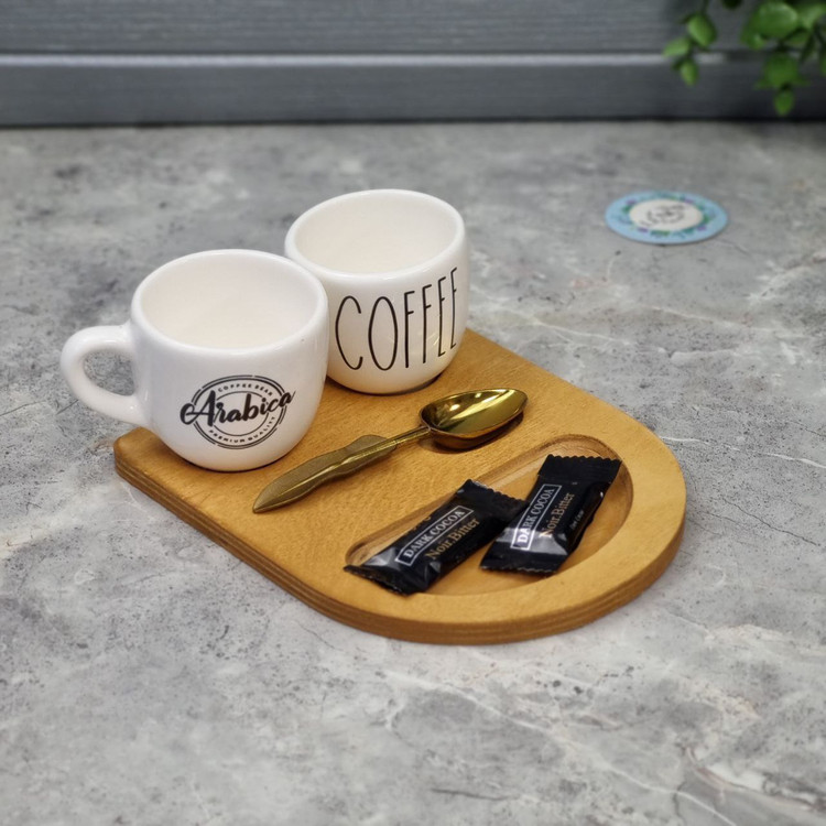 این ست تخته سرو قهوه شامل یک تخته سرو، دو عدد شات سرامیکی و یک قاشق فلزی طرح برگ است که برای سرو قهوه، اسپرسو و نوشیدنیهای گرم طراحی شده است.